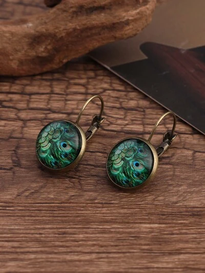 Cubic Zirconia Water Drop Charm Earrings1pc Peacock Print Round Design Earrings Copper Jewelry