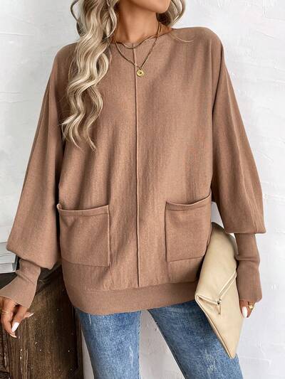 Women's Bat Wing Pocket Loose Knit Pullover Sweater, Casual Fall Sweater