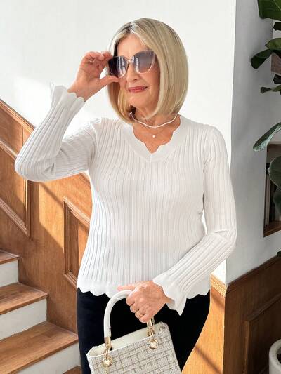 1pc Women Solid Color Lace Trim Long Sleeve Casual Ribbed Knit Sweater
