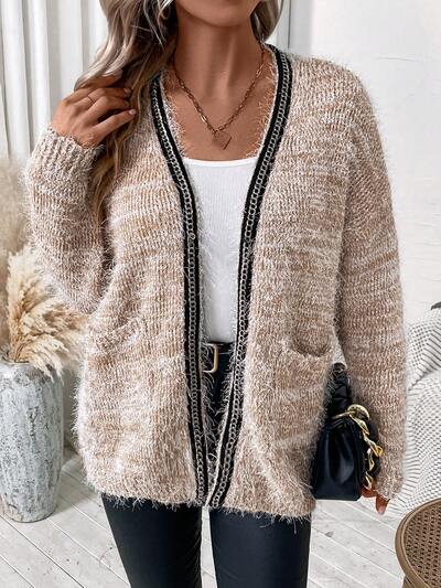 Fuzzy Trim Batwing Sleeve Fringe Trim Duster Cardigan Without Belt