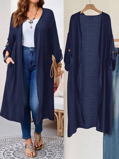 Plus Size Women's Solid Color Cuffed Sleeve Casual Long Jacket, Autumn Winter Fall