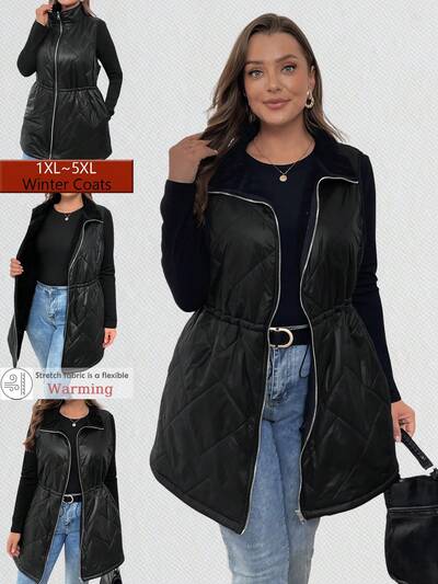 Plus Size Casual Zip-Up Drawstring Waist Padded Coat, Autumn Winter