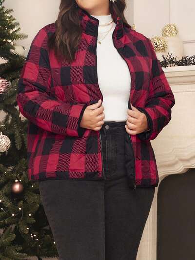 Plus Buffalo Plaid Print Zip Up Quilted Coat-60%