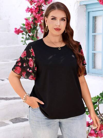 Plus Size Women's Summer Casual Vacation Elegant Floral Print Double Ruffle Sleeve Round Neck Patchwork Black T-Shirt, Casual Holiday Style,Summer Outfits For Women ,Vacation Outfits Women ,Holiday Outfits For Women,Going Out Outfits, New Clothes,Simple And Fashionable For Everyday Wear,Suitable For Summer, Vacation, Daily Wear, Festival Outfits For Women,Country Concert Outfit,Beach Outfits For Women,Gifts For Mother,Boho Top