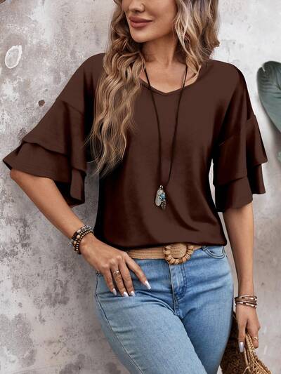 Plus Size V-Neck Ruffle Sleeve Simple T-Shirt, Casual For Everyday, Women Top Country Casual, Simple And Fashionable For Everyday Wear, Summer For Women, Vacation Woman, Spring