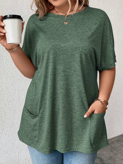 Plus Size Women's Solid Color Round Neck Batwing Short Sleeve Casual T-Shirt With Dual Pockets-44%