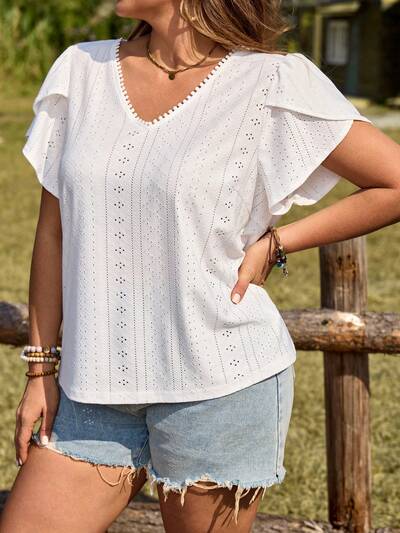 Plus Size Women's White Eyelet V Neck Ruffled Butterfly Sleeve Summer Top Breathable Casual Shirt Summer Outfit For Plus Size Women Festival Outfits For Plus Size Women Beach Outfits For Plus Size Women Vacation Outfits Plus Size Women Country Concert Outfit Boho Outfit