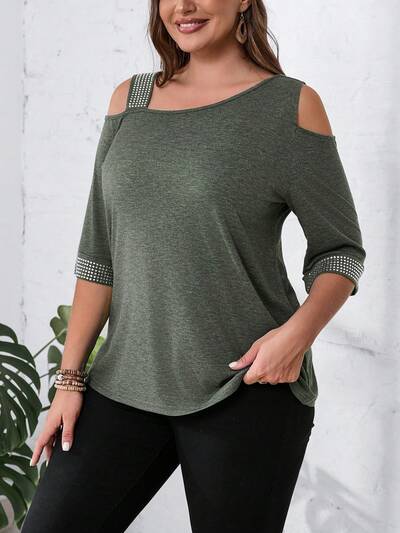 Plus Size Women's Summer Asymmetrical Neckline Half Sleeve Casual T-Shirt With Rhinestone Decoration-30%