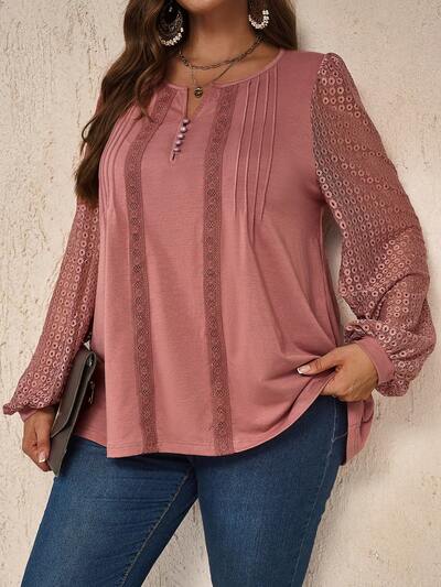 Plus Size Women's Spring/Summer Loose Fit Lace Splice Notched V-Neck Long Sleeve T-Shirt-30%