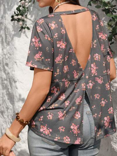 Plus Size Women Floral Print Cutout Back Short Sleeve T-Shirt, Summer/Vacation, Open Back Backless Top, Holiday Women Spring Tops Summer Casual Tops Flower Top Floral Tops For Women Open Back Shirts Women's Tops For Summer Women's Tops And Blouses Women Casual Outfits Women's Clothes Floral Print Tops