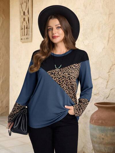 Plus Size Casual Colorblock Leopard Print T-Shirt, Autumn Women Long Sleeve Tops Casual Blue Long Sleeve Top Casual Blouses For Women