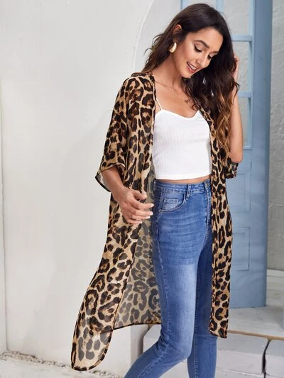 Open Front Split Hem Leopard Chiffon Kimono Summer-36%