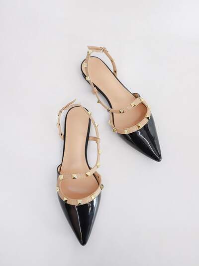 Fall/Winter Rivet Embellished Pointed Toe Flat Sandals, New Patent Leather Strap Buckle Decor Flats