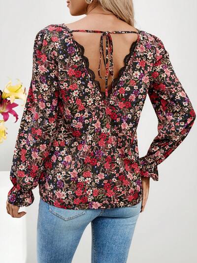 Valentine's Day Women's Romantic Printed V-Neck Long Sleeve Top, Back Lace And Strap Shirt-32%