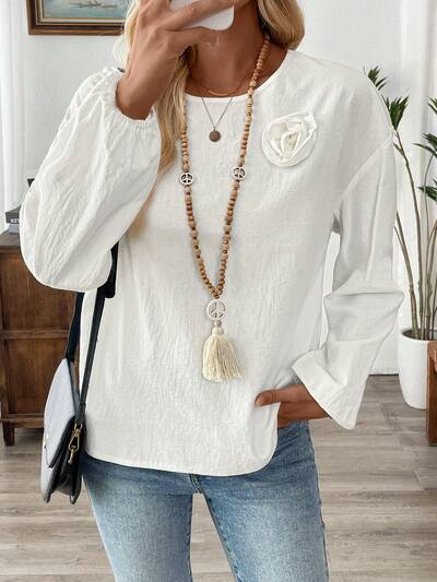 Women Casual Solid Color Dropped Shoulder Loose Fit Decorative Floral Applique Shirt, Spring & Autumn-60%