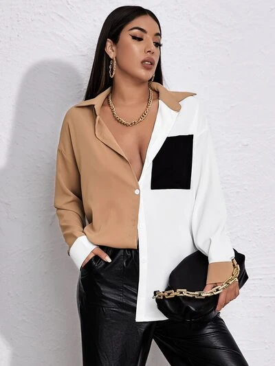 Drop Shoulder Cut And Sew Shirt,Long Sleeve Tops Fall Cloth For Women-60%