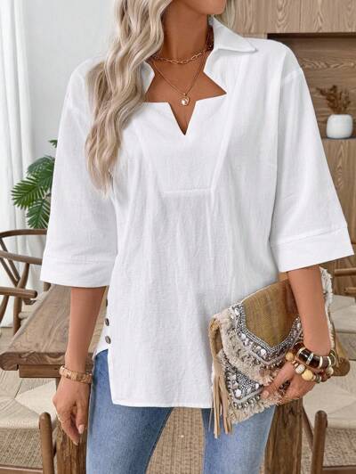 Women's Casual Plain Color Button Decor Split Hem Loose Sleeveless Blouse, Summer-46%