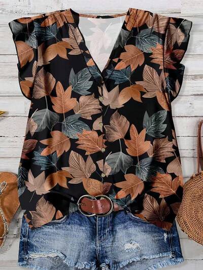 Women's Casual Leaf Print Cap Sleeve Shirt, Suitable For Summer Women Blouses Summer Fall Tops Women Leaf Print Blouse Brown Blouse Casual Blouse Chic Blouses For Women-46%