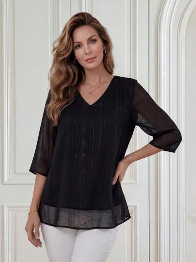Women's Solid Color V-Neck Mesh 3/4 Sleeve Loose Blouse Casual Spring Summer-33%