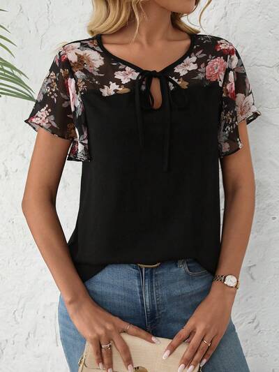 Women's Floral Print Patchwork Black Fabric Ruffle Short Sleeve T-Shirt, Casual Daily Wear, Spring/Summer-32%