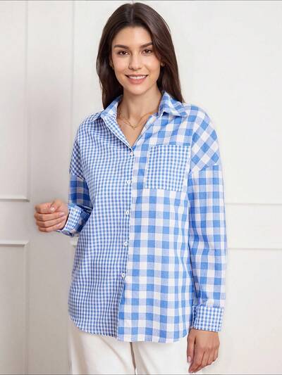 Shirts Women's Plaid Splice Drop Shoulder Elegant Blouse-49%