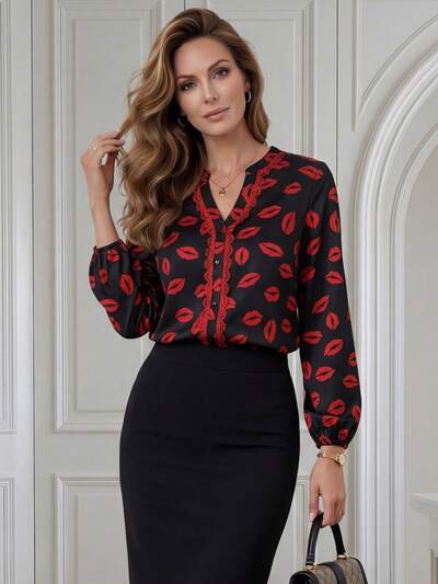 This Elegant Women's Summer Blouse Features A Classic Black Base Adorned With Vibrant Red Lip Prints And Red Lace Trim, A Striking Color-Blocking Design Perfectly Capturing The Romantic Atmosphere Of Valentine's Day. The Playful Red Lip Pattern And Lace Embellishments Add A Touch Of Sweet And Cool Style. The V-Neck Long Sleeves And Relaxed Fit, Along With The Delicate Lace Details, Create A Comfortable Silhouette That Flatters Various Body Types. Suitable For Spring And Autumn, It Can Be Paired With A Black Skirt To Enhance The Valentine's Day Atmosphere, Or Used For Casual Gatherings And Outings. Conveying Romance With The Red Lip Element While Showcasing A Fashionable And Eye-Catching Style With Its Color-Blocking Design, This Blouse Is A Versatile And Stylish Choice For Both Seasons.