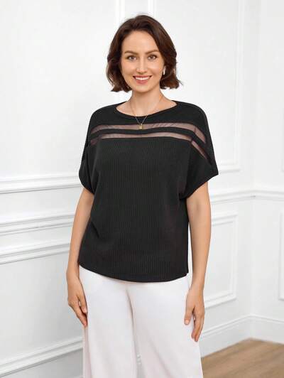 Women's Round Neck Mesh Patchwork Ladies' Elegant T-Shirt Autumn Women's Elegant Street Party Occasions Ladies' Modest Tops For Women Teacher For Women Autumn Tops Jumpsuit Short Sleeves Versatile Black Tops Mothers Day Gift For Mom, Fall