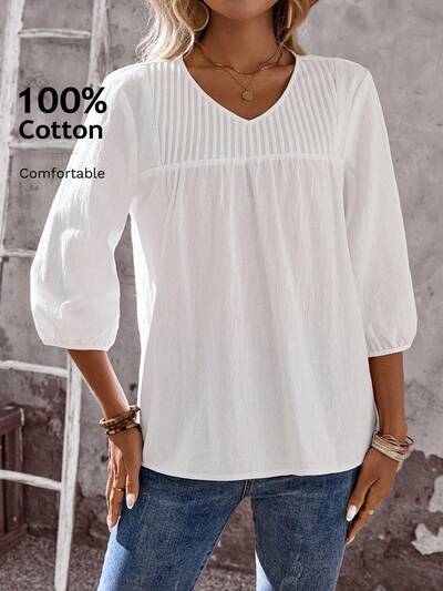 Women's Solid Color V-Neck 3/4 Sleeve Casual Loose Fit Summer Blouse Going Out Tops Women Country Autumn Basic Tops Long Sleeve Tops Women Going Out Tops Vacation Tops 100% Cotton Tops Cotton Blouses V Neck Blouses For Women Women Casual Tops White Cotton Blouse