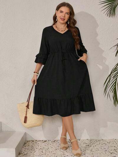 Plus Size Women's Solid Color V-Neck 3/4 Sleeve Dress, Summer Plus Size Black Dress Plus Casual Dress Curve Dresses With Pockets
