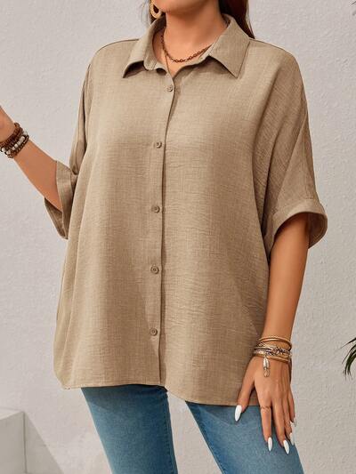 Plus Size Women's Solid Color Batwing Sleeve Loose Single-Breasted Casual Shirt,Vacation,Summer Oversize Shirt For Women Short Sleeve Blouses