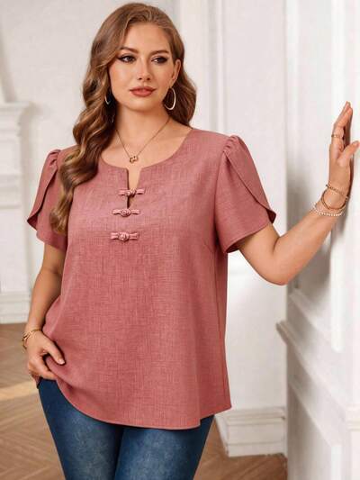 Plus Size Short Sleeves Simple Fashion Casual Everyday Vacation Spring Summer Blouse,Western Wear,Spring/Summer Blouses For Women Plus Solid Color Tops Blouse With Ruffle Sleeves Vacation