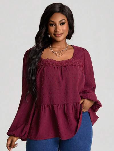 Plus Size Women's Spring/Autumn Casual Commuting Solid Color Contrast Lace Peplum Hem Blouse With Lantern Sleeves/Valentine's Day