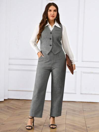 Plus Size Women 2 Pieces Set: Single-Breasted Vest And Pants, Business Casual Outfit Business Casual Woman Two Piece Outfits New Year Look Stylish Clothing Collection