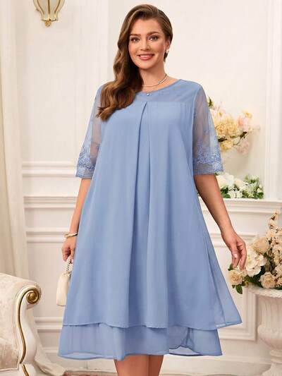 Plus Size Lace Patchwork Round Neck Simple Casual Elegant Dress Summer Outfits For Women Modest Dresses For Women Wedding Guest Dress Women Lace Chiffon