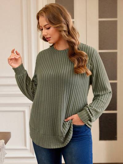 Plus Size Solid Color Minimalist Crew Neck Long Sleeve T-Shirt Plus Size Long Sleeve Plus Size Solid Color Ribbed Knit T Shirt Plus Size Casual Tops Plus Size Jumper Plus Size Sweater