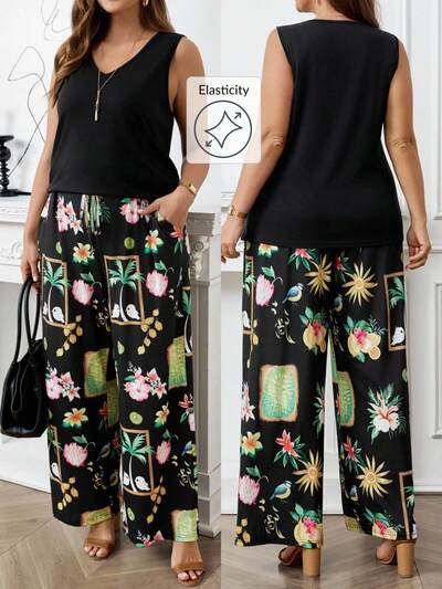 Plus Size Sleeveless Black V-Neck Long Tank Top And Tropical Fruit & Plant Print Pocket Long Pants Knit 2 Pieces Set, Suitable For Spring/Summer Office Outfits For Women