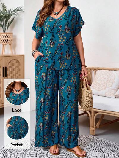 2pcs Plus Size Floral Print V-Neck Short Sleeve Top And Pocket Decor Long Pants Set Summer Pants Sets For Women Blouse And Pants Set Boho Pants Set Plus Size Pants Set Fall Women Clothes,Holiday Outfits For Women,Flower/Vacation/Spring