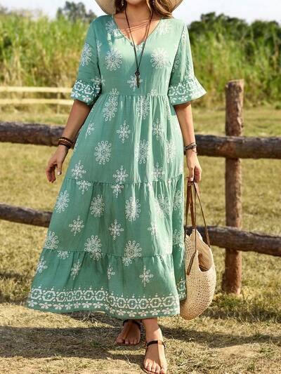 Plus Size Women's Summer Casual Vacation Country Floral Print Green Long Dress, Casual Holiday Style,Summer Outfits For Women ,Vacation Outfits Women ,Holiday Outfits For Women,Going Out Outfits,2026 New Clothes,Simple And Fashionable For Everyday Wear,Suitable For Summer, Vacation, Daily Wear, Festival Outfits For Women,Country Concert Outfit,Beach Outfits For Women,Western Style,Flowy Dress