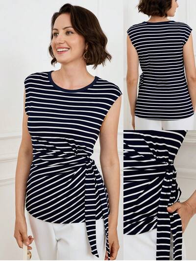 Women's Casual Everyday Wear Round Neck Striped Print Drawstring Waist T-Shirt, Spring/Summer Striped Printed Top Teacher For Women Going Out Tops