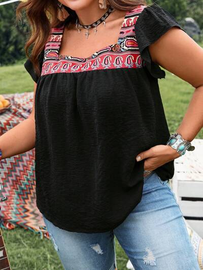 Plus Size Black Square Neck Faux Embroidery Graphic Print Flowy Peasant Top With Ruffle Sleeves, Bohemian Style Blouse For Women, Suitable For Spring/Summer Country Music Music Festival Bohemian Clothes