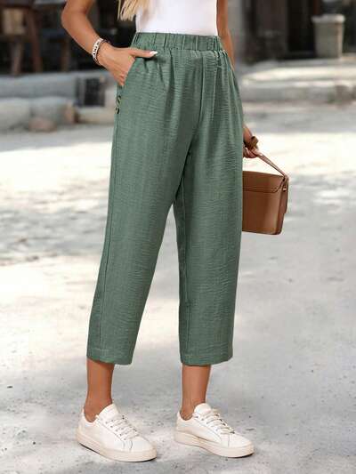 Women's Casual Solid Color Elastic Waist Side Pockets Cropped Pants Summer Pants,Fall Women Clothes