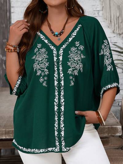 Plus Size Women Summer Floral Print V-Neck Raglan Sleeve Loose Blouse