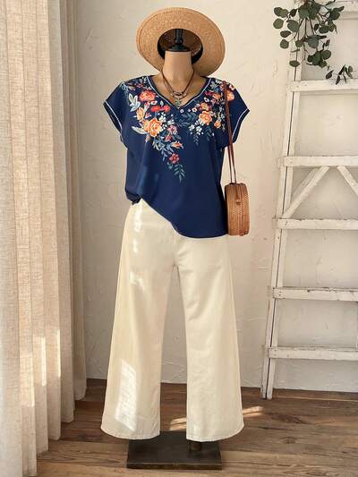 Plus Size V-Neck Short Sleeve Top, Country Casual Vacation Woman, Simple And Fashionable For Everyday Wear, Summer Top Women