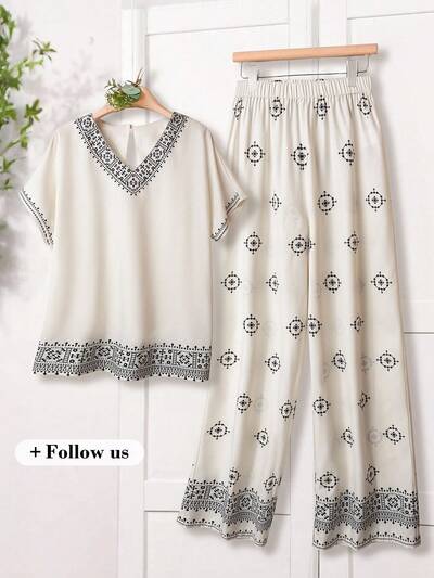 2pcs/Set Women Geometric Print Shirt And Pants Casual Holiday Suit