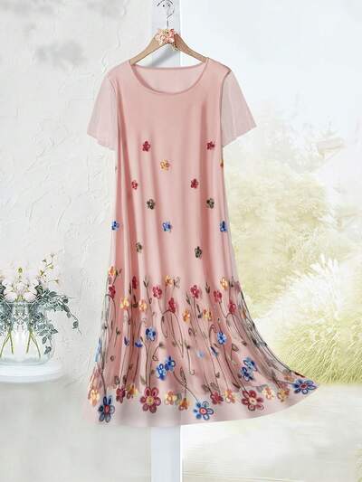 Plus Size Women Mesh Floral Embroidered Mesh Panel Short Sleeve Dress Summer Outfits Vacation Outfits Woman Country Outfits Women Spring Outfits For Women Wedding Guest Dress Women