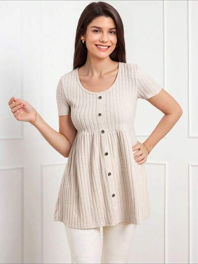 Women's Solid Color Front Button Short Sleeve Casual T-Shirt, Everyday Wear