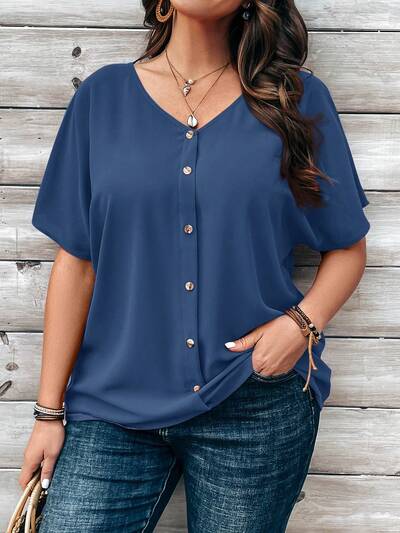 Plus Size Women's Blue Button Embellished Short Sleeve Shirt For Spring-44%