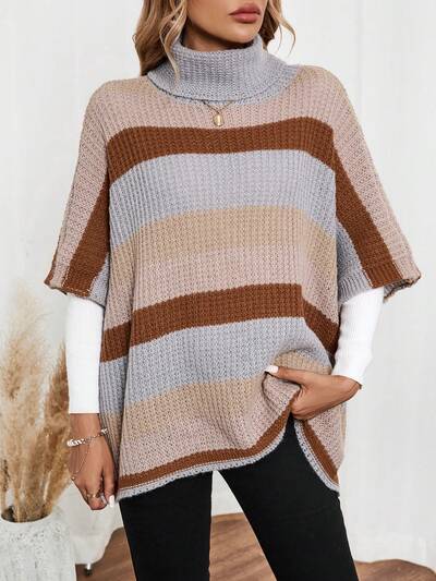 Women's High Collar Batwing Sleeve Loose Striped Casual Sweater, Autumn/Winter-60%
