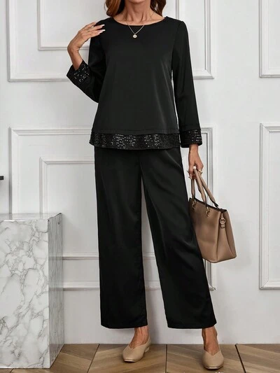 2pcs Women Solid Color Lace Patchwork Crew Neck Long Sleeve Top And Pants Elegant Outfit-32%