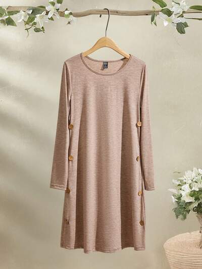 Women's Solid Color Round Neck Long Sleeve Button Design Casual Pocket Short Dress, Autumn-35%